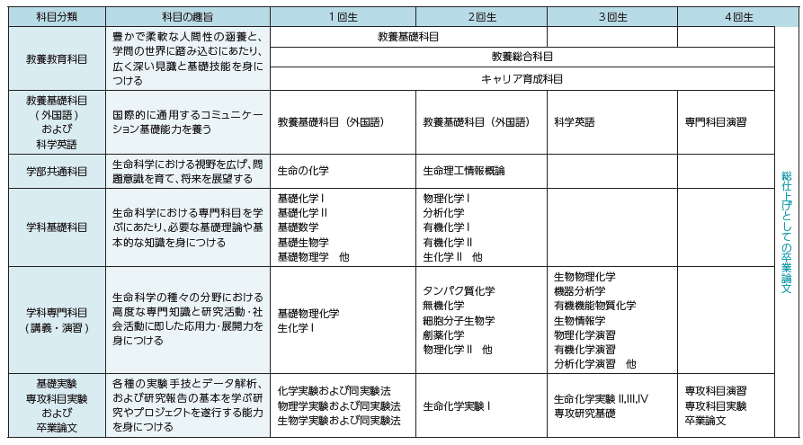 本学科では化学を駆使し生命や物質の本質を追究することを目的としています。そのために基礎化学、物理化学、分析化学、有機化学、生化学、タンパク質化学、高分子化学、創薬化学など幅広い専門科目を用意しています。広範で深い知識の習得と共に、柔軟で論理的な思考力の育成を目指します。