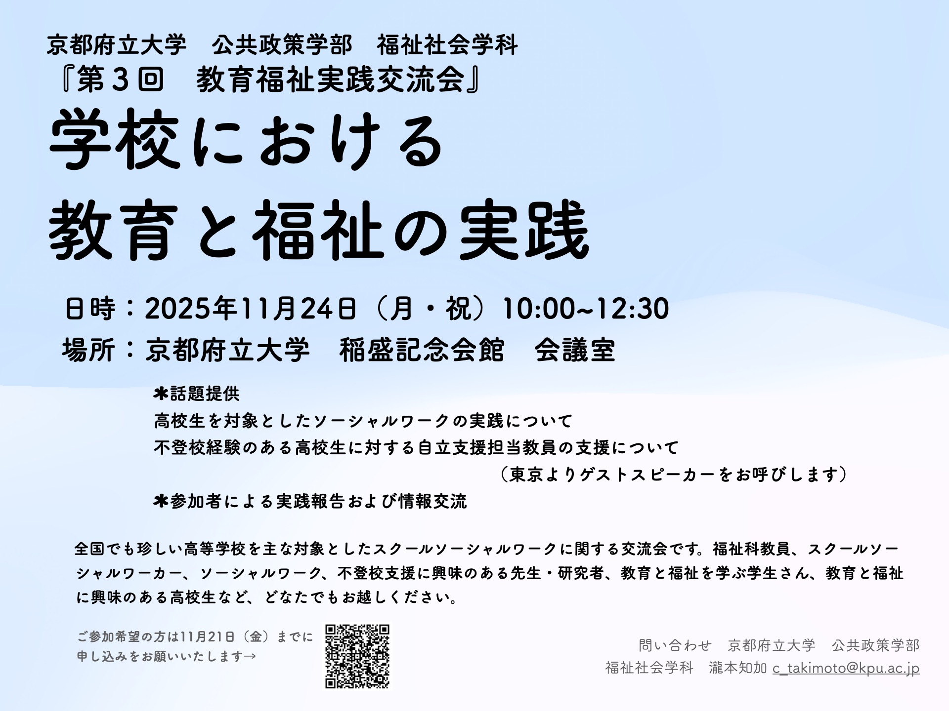 お問い合わせ:瀧本知加(公共政策学部 福祉社会学科) c_takimoto@kpu.ac.jp