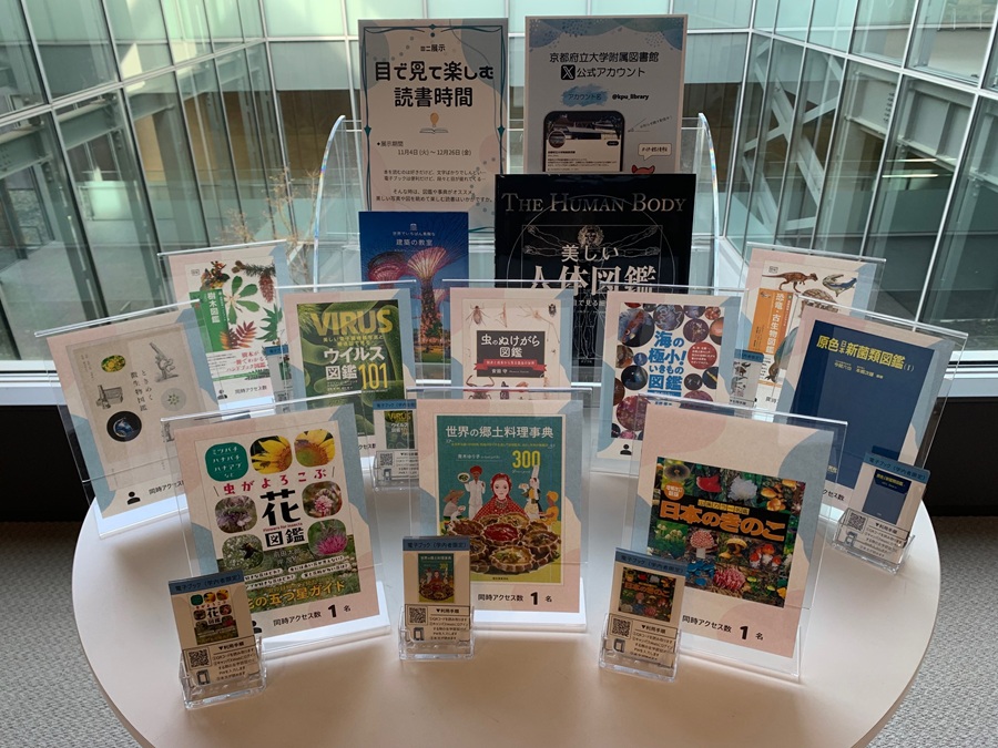 秋のミニ展示「目で見て楽しむ読書時間」【~12/26(金)】 ただいま開架III前のスペースでは、図鑑や事典など、図が多く掲載されている本の展示を行っています。 文字を「読む」だけではなく、美しい図や写真を「見て」楽しむ読書時間を過ごしてみませんか。 展示場所:開架III前のスペース 展示リスト (PDF ファイル 0.72MB)