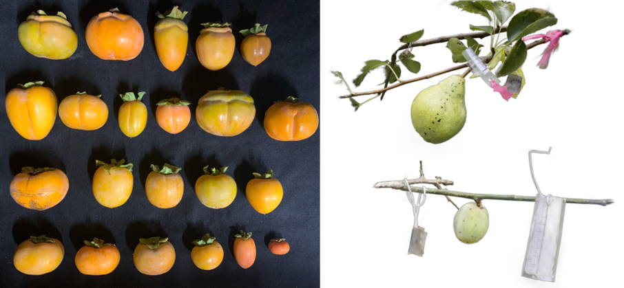 図:(左)京都大学附属京都農場に保存されている多様な形状のカキ(写真提供:久住あかね)、